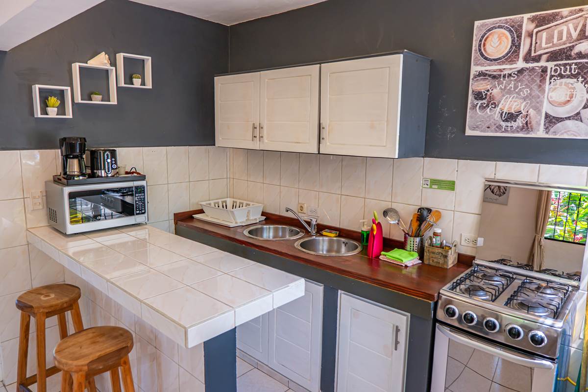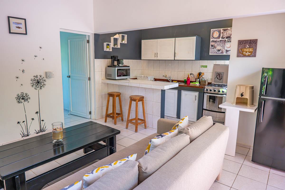 1 open kitchen with dining area (refrigerator, kitchen utensils, hotplates)
