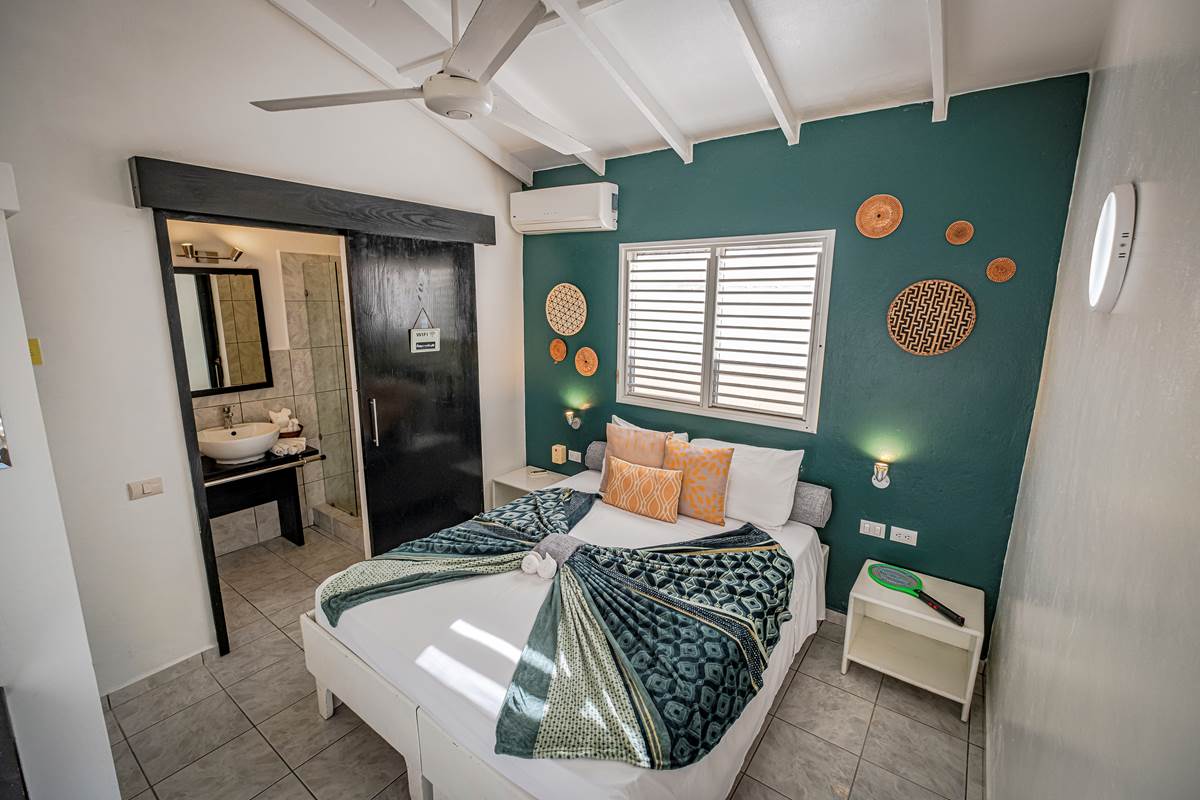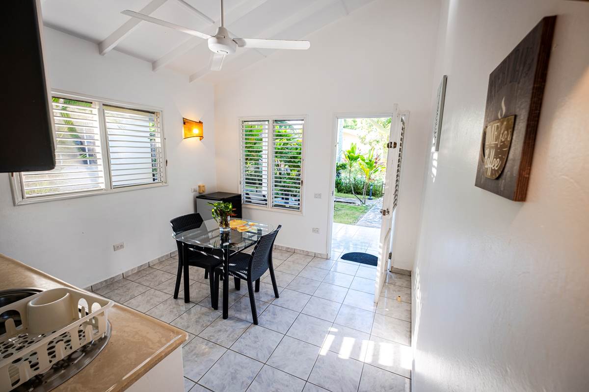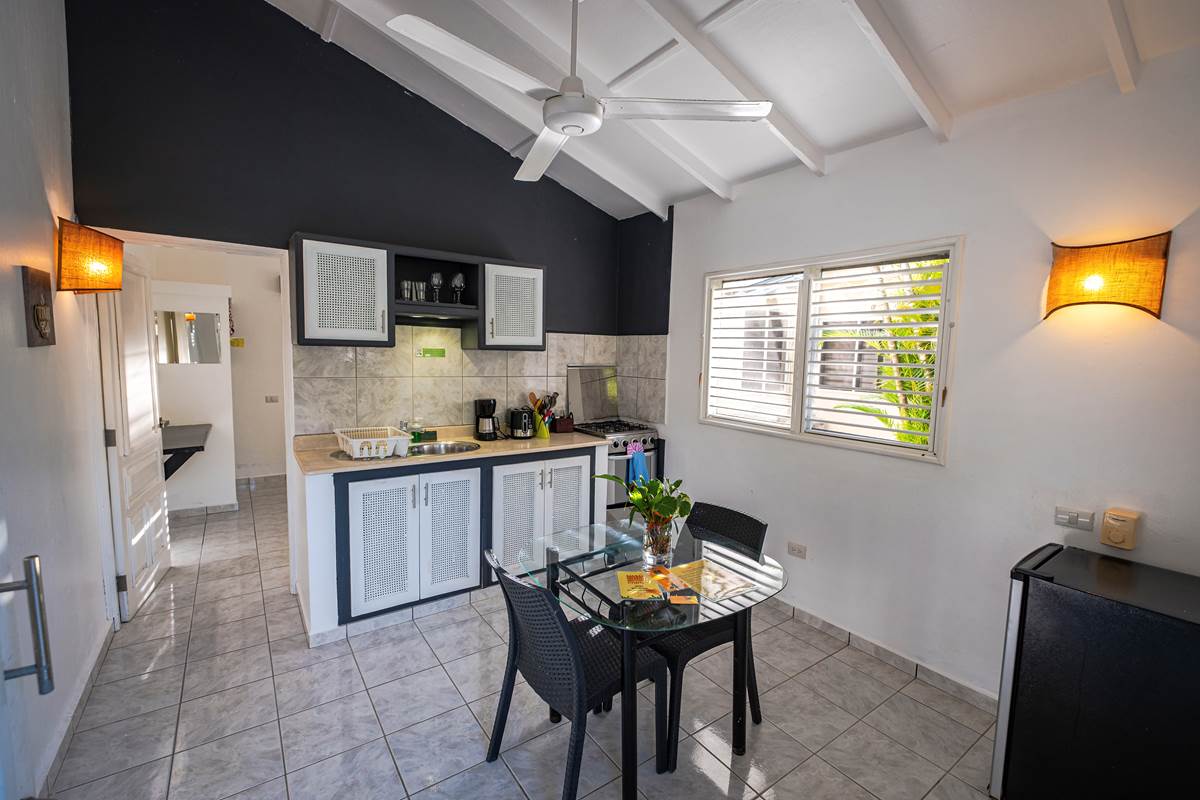 1 cuisine ouverte avec espace repas (réfrigérateur, ustensiles de cuisines, plaques de cuisson)